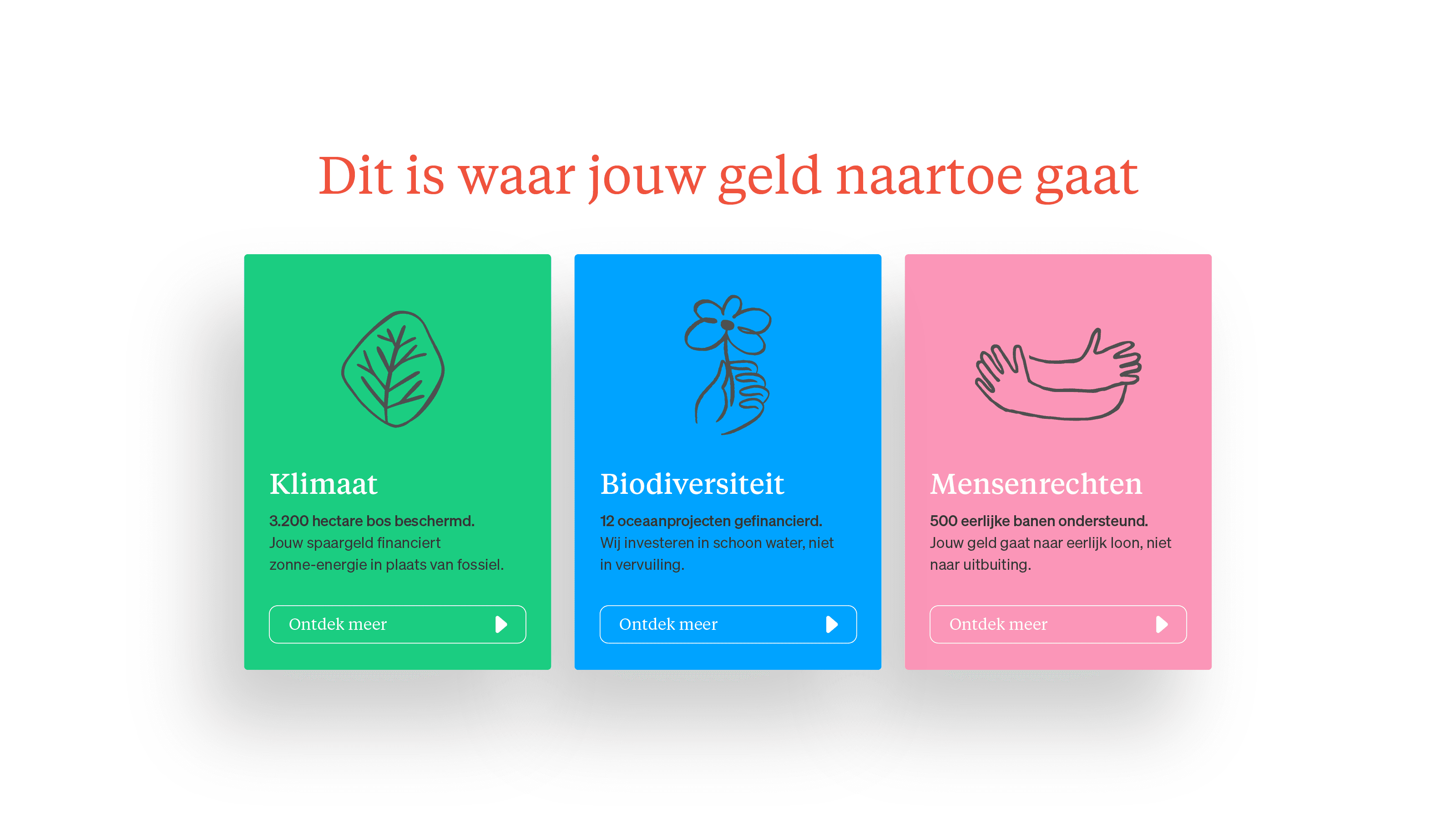 The tone of voice shifts from abstract to concrete. From "we invest in sustainability" to "your money works on solar energy, not fossil fuels." From passive to active, from cerebral to emotional. Honest, concrete, inviting, action-oriented.