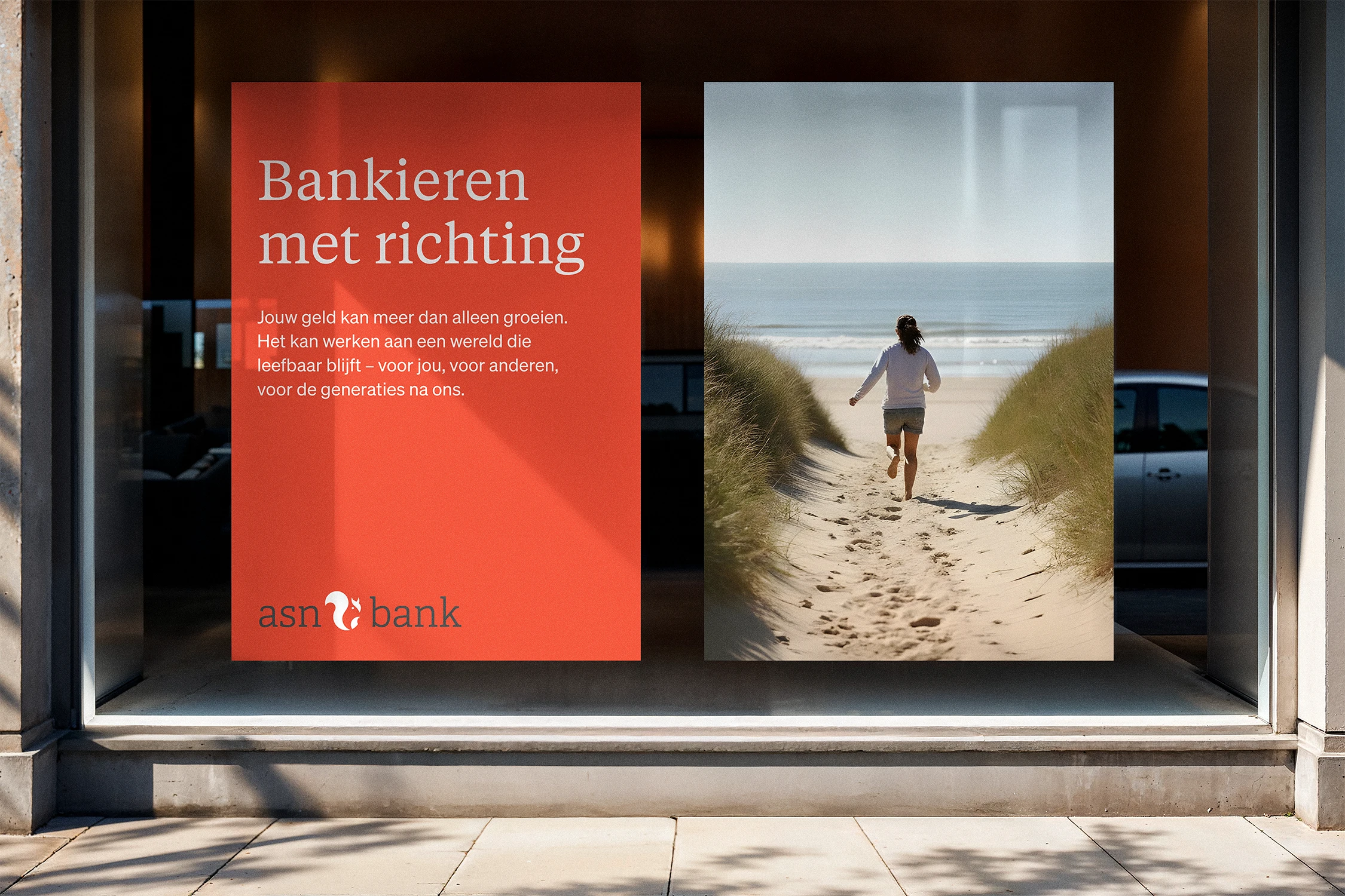 The gap between being recognized as "the most sustainable" and feeling like "the best choice" needed to be bridged. People know ASN does good work, but don't feel emotionally connected to it. The rebrand introduces "Bankieren met richting" (Banking with direction) – a proposition that combines agency (your choice) with ease (we do the complex screening work).