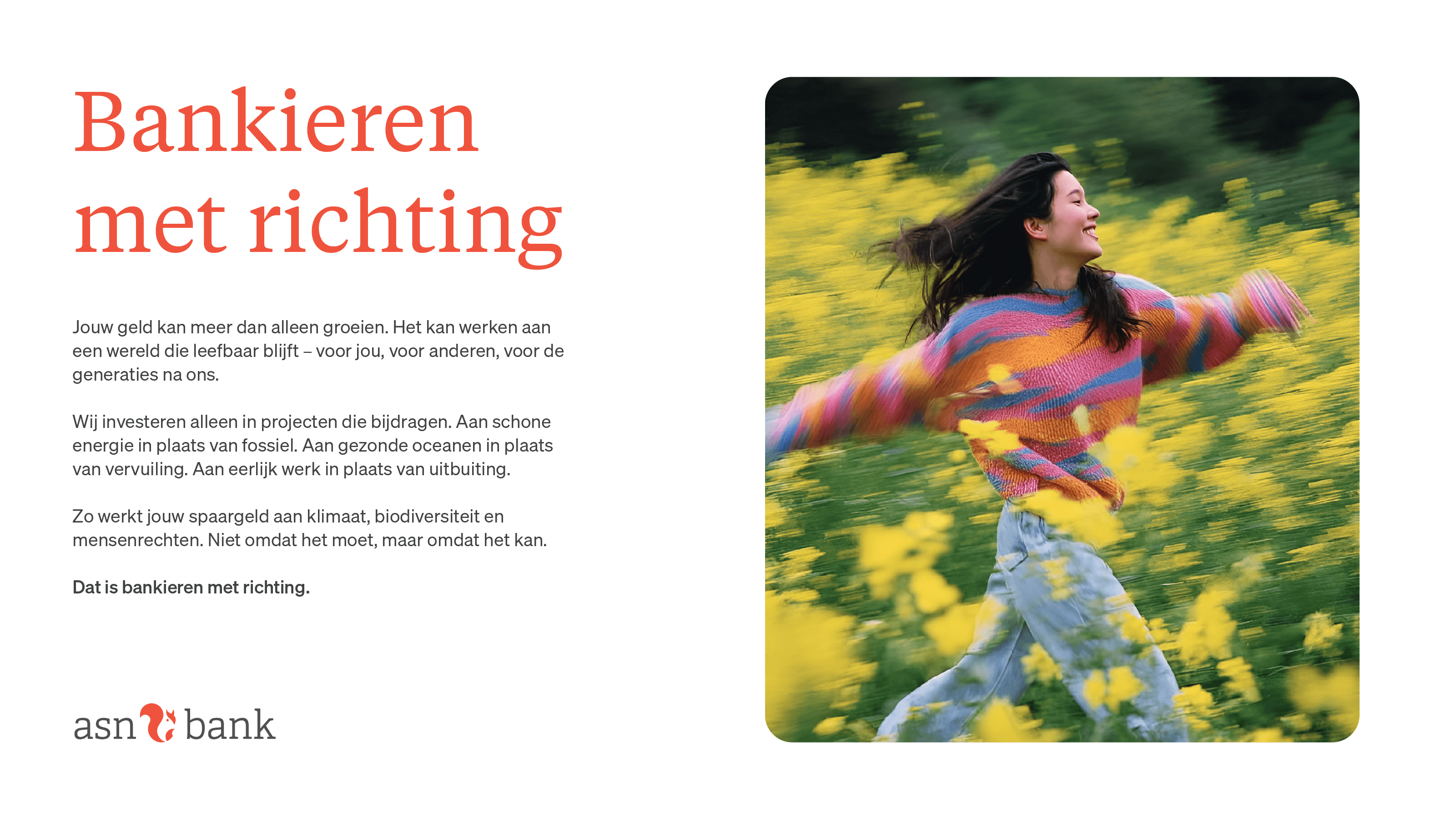 For six years running, consumers have voted ASN Bank the most sustainable bank in the Netherlands. Yet their communication wins on content but loses on feeling. Too abstract, too safe, not distinctive enough. The result: they fail to attract a new generation.