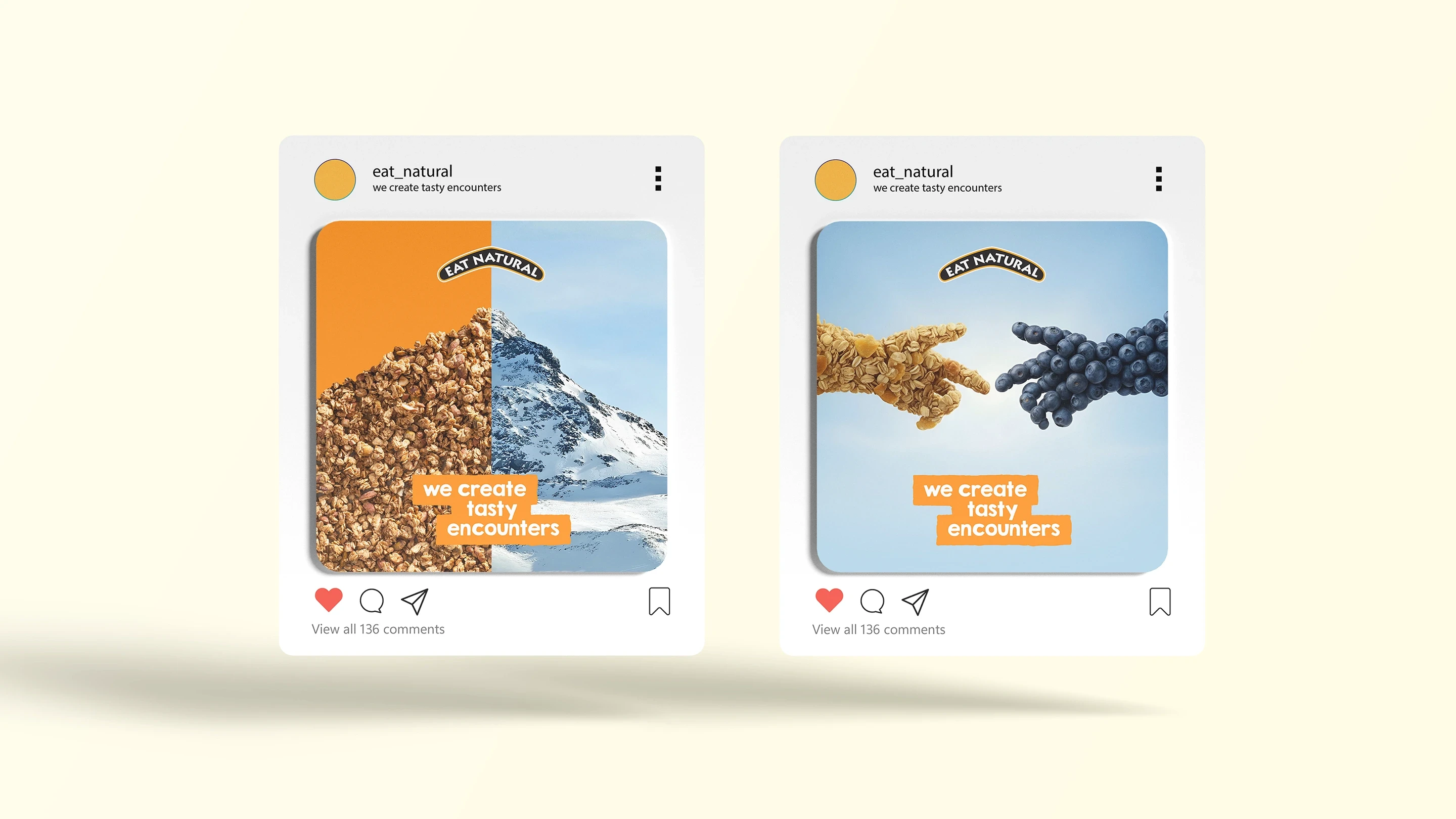 The answer was lightness. Against a backdrop of paper textures and warm, natural light, ingredients move like they're enjoying themselves — yoghurt swirls, caramel pulls, nuts and fruit caught mid-air. Not a product shot. A mood. The world of Eat Natural is a genuinely happy place, and every visual had to earn that feeling rather than just claim it.